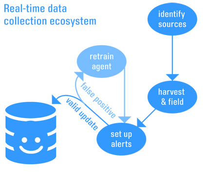 The methodology—harvesting-monitoring-updating—is conceptually very simple. It does, however, take significant upfront investments and offshore resources to pull it off. First of all, you need to identify the sources of the data to harvest. Then you need to accurately harvest the desired data, fielding it as you go. Next is setting up the “pinging” mechanism to monitor changes and trigger alerts. And finally comes the act of analyzing the alert and either updating a database or using the “false positive” result to train the monitoring mechanism so it avoids future false positives.